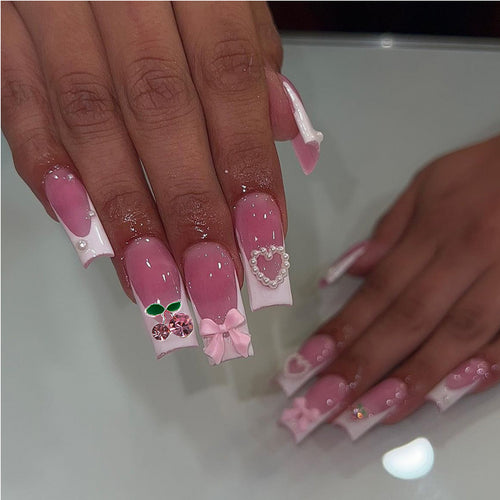 Strawberry Pink French Long Square Press On Nails with Heart, Bow, and Pearl Details